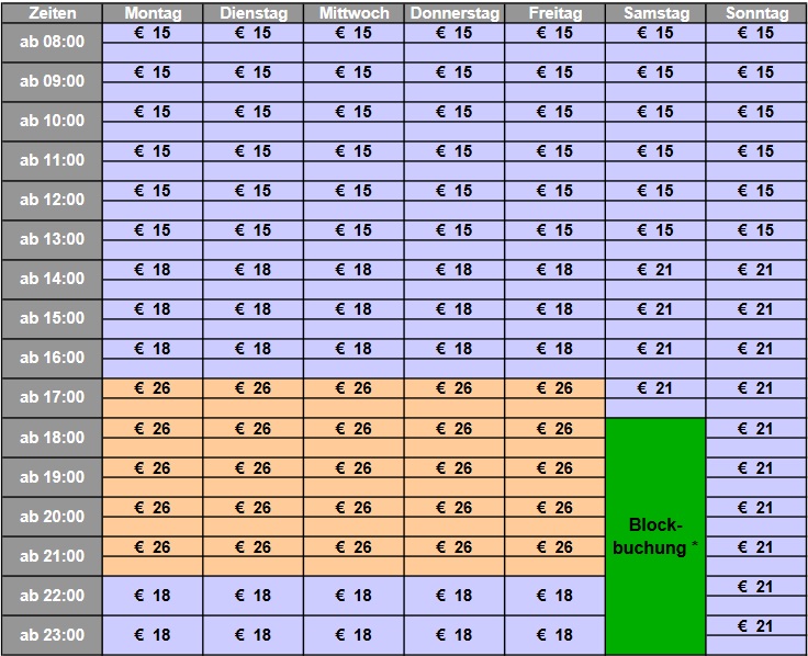 In der Blockbuchungszeit am Samstagabend können nicht vergebene Zeiten wie normale Stunden zu 21,-- € gebucht werden.